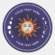 Mystic Sun Custom Sticker featuring a mystical design inspired by astrology, esoteric, occult, and mysterious elements. This design has hues of blue, purple, and orange, a starry background, a sun with a face and moon phases. Includes a template for personal customisation.