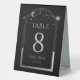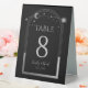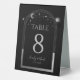 Mystical Black Silver Sun Moon Stars Wedding Table Numbers Table Tent Sign features a silver sun, moon and stars frame on a black background. Inside is your custom table number information. Designed for you by ©2022 Evco Studio www.zazzle.com/store/evcostudio