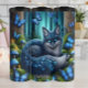 This mystical image features a beautiful blue fox with glowing blue eyes, curled up in a fantasy forest. The fox's body and tail are adorned with intricate, leafy patterns. It is surrounded by large blue butterflies, moss-covered ground, and glowing mushrooms, all set against a backdrop of tall, stylised trees.