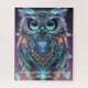 A stunning artwork featuring a majestic owl with vibrant blue feathers glowing with ethereal light. The owl's piercing blue eyes captivate with wisdom and mystery. Intricate patterns adorn its plumage, illuminated by magical glowing accents. Perfect for nature lovers and fantasy art enthusiasts. Ideal for puzzle lovers seeking a visually enchanting challenge.