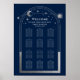 Mystical Blue Silver Sun Moon Stars Astronomy Wedding Seating Chart Wedding Sign Instant Download Digital Printable Poster Prints features a silver sun, moon and stars frame on a blue background. Inside the frame is the text "Welcome" in elegant silver calligraphy script and your custom wedding reception seating chart information. Designed for you by ©2022 Evco Studio www.zazzle.com/store/evcostudio