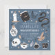 Plan your fortune teller, gypsy, or Halloween themed birthday party with these spooky chic invitations in a boho nature inspired colour palette. Design features illustrations of a snake, spellbook, candle, jar, skull, tarot cards, and potion surrounding your birthday party details.