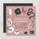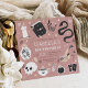 Plan your fortune teller, gypsy, or Halloween themed birthday party with these spooky chic invitations in a boho nature inspired colour palette. Design features illustrations of a snake, spellbook, candle, jar, skull, tarot cards, and potion surrounding your birthday party details.