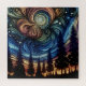 Mystical ai art with a swirling blue and orange sky with silhouettes of pine trees.