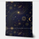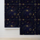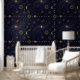 Unveil the magic of the cosmos with this stunning mystical wallpaper design. This dramatic pattern features intricate golden line work depicting celestial bodies, including smiling suns, crescent moons, classical star constellations, and majestic swirling galaxies. Set against a deep, dark navy blue background, the golden detailing and central sparkling band of stars create an elegant, antique, and slightly occult aesthetic. Ideal for a feature wall in a moody bedroom, a unique office, a creative studio, or a themed powder room, this design adds a sophisticated, mystical flair to any interior space. Search ID1239 to see all the products in this design set. Note: design adapted from generative content.