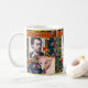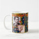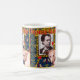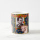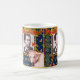 Dogs love classical music. At some animal shelters, the dogs go to sleep each night with the soothing sounds of classical music. When the music begins, they all stop barking and settle down to sweet dreams. The designs in this "Dogs love classical music." series celebrate the intuitive connection between dogs and this wonderful music. The design on this mug features a portrait of the composer Gustav Mahler. The portrait is in an ornate gold and wood frame, on a wallpaper background of deep marine blue, with twirled red ribbons, green leaves and little song birds. In front is a photo of a dog, commenting (in English and French), and pointing with red arrows to the composer. The text says "Mystical Mahler".