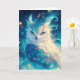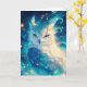 A mystical owl with piercing golden eyes and flowing ethereal feathers stands against a cosmic backdrop filled with glowing stars and swirling blue light. The celestial tones blend seamlessly into the owl’s radiant plumage, creating an enchanting and otherworldly presence. This stunning design captures the magic of the night sky and the wisdom of this majestic bird.