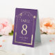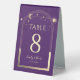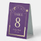Mystical Purple Gold Sun Moon Stars Wedding Table Numbers Table Tent Sign features a gold sun, moon and stars frame on a purple background. Inside is your custom table number information. Designed for you by ©2022 Evco Studio www.zazzle.com/store/evcostudio