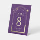 Mystical Purple Gold Sun Moon Stars Wedding Table Numbers Pedestal Sign features a gold sun, moon and stars frame on a purple background. Inside is your custom table number information. Designed for you by ©2022 Evco Studio www.zazzle.com/store/evcostudio