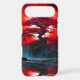 Dramatic fantasy landscape with a glowing crimson tree standing beneath a luminous full moon.