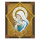 This design is inspired by a beautiful painted and embroidered decal on a Roman Catholic vestment worn for masses of the Blessed Mother. She holds a stem of lilies in her hands, a bouquet of roses frame her, a halo crowns her head.