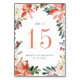Chic floral table number cards feature a frame of watercolor flowers winter flowers, poinsettia and berries, framing your table number in white. Personalise with your names and wedding date, or name each table for an extra personal touch.
