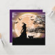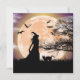 Magical setting for Halloween. A backdrop with a colourful purple-blue, cloudy, night sky with stars and an orange, full moon that has the silhouettes of the a witch, a cat, bats, and a dormant tree.