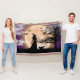 Magical setting for Halloween. A backdrop with a colourful purple-blue, cloudy, night sky with stars and an orange, full moon that has the silhouettes of the a witch, a cat, bats, and a dormant tree.