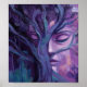 This surreal poster features a purple oil painting of a serene woman's face entwined with gnarled tree branches - dreamy, textured portrait evoking mystical, nature-inspired art. Finished in a oil acrylic painterly style.