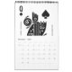 Each month is illustrated by a single playing card, a queen, king or jack from all four major suites: Spades, Hearts, Diamonds and Clubs. The illustrated characters represent ancient mythological deities.