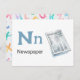 "Letter N is for Newspaper" in our Alphabet Flash Card set. Get all 26 letters of the alphabet! A double-sided postcard that is great for memory games and teaching, geared for education, schools, teachers and homeschoolers for kindergarten and babies. All text is editable if you need to customise.