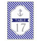 Navy blue, white stripes and anchor navy blue nautical wedding seating table number place card. A stylish striped pattern design with navy blue, white diagonal stripes, a grey anchor with a navy blue love heart and rope and grey and white text in a frame with a blue banner. Contemporary yet with a vintage look in a sense. You can change background and text colour choosing from Zazzle colour chart. This classy design is a completely customisable template and is part of a wedding set perfect for a summer nautical or beach wedding.