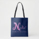 Pretty hand drawn N monogram name and meaning bag design. Ideal for a personalised gift for a girl who has a name beginning with N. This example reads Nadia Giver of hope, tender, athletic and well spoken or you can customise the text with your own name and meaning words if required. Background colour currently dark blue but you can also change this to your own choice of colour if required. Ideal as a special birthday or celebration gift. If you need help with your own personalised name please contact me. Capital letter N typographical hearts and flowers drawing and graphic conversion in shades of bright pink and purple © unique art text and design by Sarah Trett. www.sarahtrett.com for www.mylittleeden.com