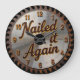 This image displays a round wall clock designed to look like a circular saw blade. The clock face is metallic silver with a distressed, rusty brown texture around the outer edge, mimicking the teeth of a saw blade. The phrase "Nailed it Again" is prominently featured in the centre in a bold, dark orange, stylised font with a slight shadow effect. The numbers 1 through 12 are also in a matching dark orange. The clock has dark grey hands and is framed by a thin green outer rim. The overall design suggests a theme of craftsmanship, DIY, or success.