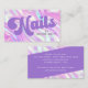 Trendy business cards featuring your name and the text "Nails" in a purple, retro font on a printed background reminiscent of crinkled plastic in pale pastel holographic colours and contact information on the back.