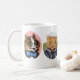 This cute cat mug features four illustrations of cats who have appeared in the vintage art of famous English cat artist Louis Wain (1860 -1939). There's the cat in the blue bow tie, the smiling cat, the knitting crazy cat and the little poorly kitten with a bandage round his head. We thought it would be fun to name the cats - you can easily do this by using the customise button to add your own pet name for each cat. What about Beau for the handsome boy in the blue bow tie, for instance? Give these cats a good home - they don't cost anything to feed! The mug would be the perfect gift for admirers of the wonderful Louis Wain, cat owners and fans of vintage cat art.