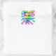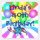 A bright, fun colourful balloon bouquet on a rainbow of colourful ribbon swirls ready for you to personalise with any name and birthday age. For any age, including over the hill birthdays! Shown is "Linda's 40th Birthday!!" A great special occasion fun and colourful sticker! Shown is the square sticker.