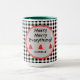 A classic black and white buffalo check pattern with red and grey circle frame and mini Christmas trees. "Merry Merry Christmas" and name are in a black modern font. Easily change text and name to make it yours using the Template provided. Use lowercase letters for name if you need more space. This is a large 15oz. combo colour beverage mug, choose from 5 colours for inside and handle. A smaller 11oz is also available with a choice of 10 colours. See "About This Product" at side for more information.