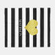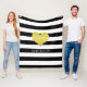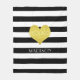 Fleece blanket with a stylish gold heart print on a black and white striped pattern with personalized name print. Matching home decor available.