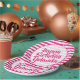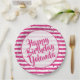 The trendy geometric pattern is a fuchsia and white simple stripes pattern and confetti. There is a white circle in the centre for your text and a text template so you can easily change it to your own words, name, or event.