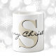 "Merry Christmas" in elegant black script, a large subtle initial in June birthstone pearl colour, and name in a simple modern font decorate this 11oz classic coffee mug. Large capacity for hot or cold beverages. Easily change the initial, text and name to make it yours using the Template provided. Ideal for family Christmas morning coffee or celebrating throughout the winter holidays. Also available in 15oz and many other mug styles. See "About This Product" for more information. Special pricing.