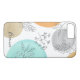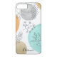 This modern and stylish phone case is decorated with an original line drawing leaf pattern with watercolor shapes in ochre, turquoise, beige and grey on a white background.