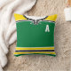 Easy to edit ice hockey or lacrosse custom jersey design throw pillow. The colours of this design are green, gold and black, the white parts can be changed, just click 'CUSTOMIZE' to choose a different colour. Just use the boxes to the right of the image to insert your own choice of name and number. You can also add either a captains 'C' or alternate 'A' or the sweater number on the front too.