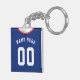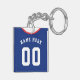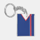 Easy to edit soccer / football / sports jersey keychain, just use the boxes to the right of the image to insert your own choice of name and number on the back. The design of this jersey is in blue with red and white side stripe down the front, and red and white v-neck collar. The background 'skin' colour can be edited, just click on CUSTOMIZE.