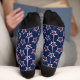 Awesome contemporary socks for the 4th of July 250th Semiquincentennial celebration. A pattern of small red stars inside outlined white stars on a navy blue sock. White name outlined in navy blue is on the front. True One Size Fits All (Size 5 Female to Size 11 Male). See 'About' for more information and care.
