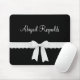 An elegant white bow and ribbon set against a striking black background, featuring a personalized name.