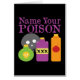 This funny "Name Your Poison" cartoon illustration features a green bottle with a yellow skull on it, a purple moonshine bottle with x's and an orange bottle with a red bomb on it! This cool drinking humour design is the perfect gift to buy for a bartender who lives life on the dark side or anyone who likes their drinks to be fun and dangerous!