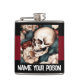 This spooky flask has a black and maroon striped background, with an image of a skull and flowers, on the front. Underneath the image is the text “NAME YOUR POISON”.