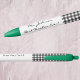 Stylish black and white classic buffalo check pattern covering half the pen with 'Best Teacher Ever!' in a script font and student's name on white background. This pen can be edited for any theme or recipient imaginable. Easily change names and text to make it yours using the Template provided. You can also edit font style, color and size. Black ink and trimmed in green or choose your own colors. Minimum purchase of 2. See "About" for more information. Made in U.S.A.