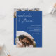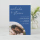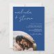 A modern, chic and elegant wedding invitation with arch, script names with a hand written calligraphy in blue colour of the year and white with an arched photo and another 3 photos at the back. A modern all in one wedding invitation with rsvp, details , accommodations and qr code. All the text, names and background colours are customisable. A simple and minimalist invitation.