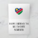 Beautiful design includes happy balloons and ticker tapes with the words "Happy Birthday", covered in the colours of the Namibia flag. Design is finished with the heart in the Namibia flag colours and the Birthday message. Elements are fully customisable using "Customise it!" feature. This colourful birthday card is the perfect present for your friend from Namibia. © CountriesOfTheWorld