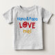 Nana and Papa Love Me T-shirts, hats, sweatshirts, rompers, bodysuits, sleeveless dresses, ruffled shirts and dresses, long sleeve tees, raglan T-shirts, and much more with a colourful and fun blue, red, and gold text and heart design.