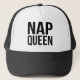 Hey, lazy girl. Show off your love for the mid-day snooze with this punny design. Black and white trucker hat features a play on "Trap Queen" with “Nap Queen” in clean black text.