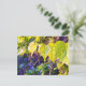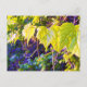 Sunlit grape leaves and delicately curling tendrils make a striking image against a background palette of blue, purple, pink and green.