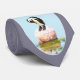 A little penguin is sitting on a round rock in a tidal pool, with it's head bent over as it sleeps, with the warm sun beaming down on it.