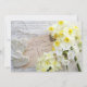 fresh narcissus flowers with salt dough ornaments and ribbon on old handwritten postcard and document