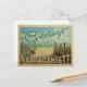 This Greetings From Narragansett vintage postcard design features a sandy beach with a beautiful turquoise ocean water and above the sea, a blue sky with billowy white clouds. In vintage travels style.