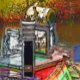 An art design of a narrowboat chimney and an old decorated lamp.Canal boats, known in the UK as narrowboats, were originally used to transport goods around the country. They are now used mainly for leisure and attract people from all over the world to enjoy our rural countryside. These boats look very pretty with their brightly colored cabins, traditionally blue, red or green. Flowers and castle designs also adorn the more traditional boats.