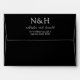 Modern wedding envelope featuring a simple and minimal black design with your monogram in a bold font along with your names in an elegant handwriting script and your return address in a serif font.