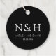 Modern wedding favour tags featuring a simple and minimal black design with your monogram in a bold font along with your names in an elegant handwriting script and your wedding date in a serif font. The back has your personalised thank you message.